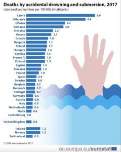 Podle statistiky Eurostatu za celou EU k roku 2017 došlo k následujícím počtům utonutí na 100 tisíc obyvatel. S číslem 1,5 se řadíme do té horší poloviny EU. Měli bychom se měřit s vnitrozemskými státy jako je Rakousko s počtem 0,6. Ale i velké přímořské státy jako jsou Itálie, Holandsko nebo Německo jsou na tom o poznání lépe než Česko.